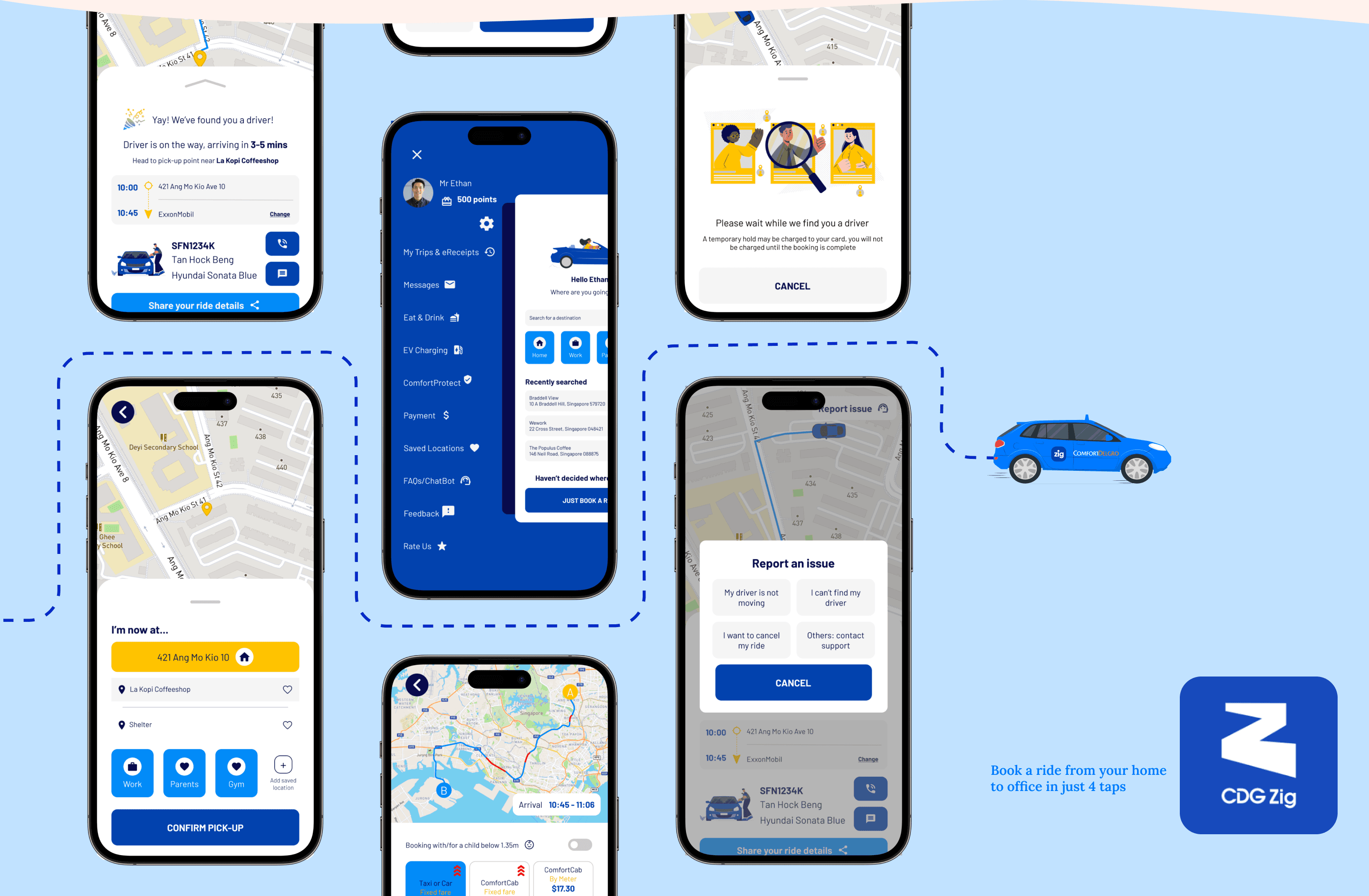 As part of the UX Design and Product Management course conducted by NTU, I redesigned ComfortDelGro’s Zig mobile app for my capstone project. Along with 3 other members, we conducted research to consolidated our findings before embarking separately on the ideation and design phase of the project.