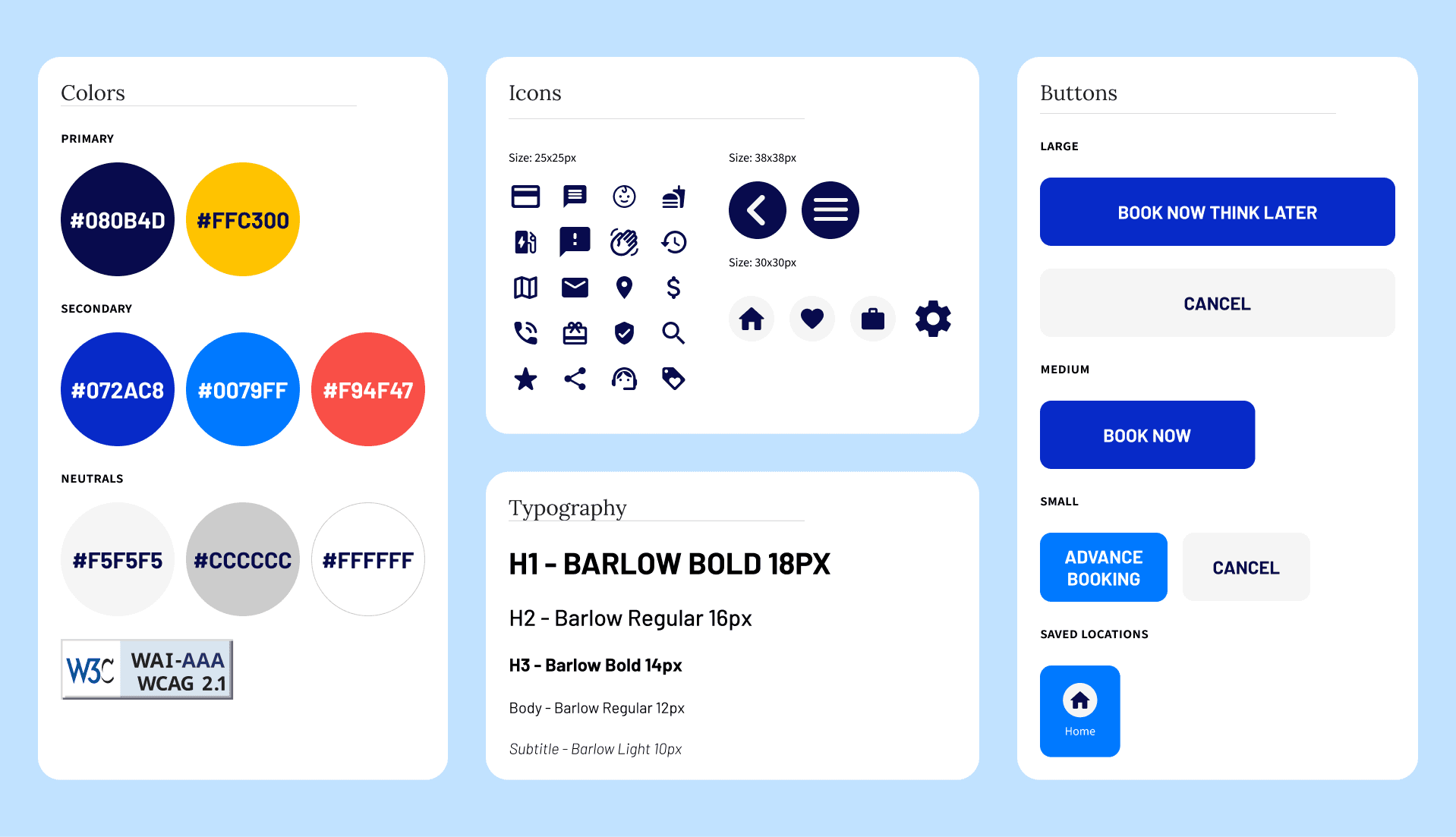 To ensure a seamless and familiar experience for riders, I developed a style guide to establish consistency in the visual elements used throughout the app. Consistent design elements create a sense of familiarity and ease of use. I chose to keep the existing sans-serif font that was in the current app due to its clean look and high readability. I also ensured optimal color contrast for text and buttons, ensuring readability and accessibility for all users even during potentially stressful moments like booking a ride in a hurry